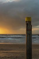 Een houten meerpaal of strandpaal met opschrift 33 HHNK op het strand bij Bergen aan Zee in Noord Holland. Het geel geschilderde topje van de paal correspondeert mooi met de goudgele lucht van de zonsondergang. Er hangen zware donkere regenwolken en in dekverte boven zee zie je een regenbui. Op het strand waaide het flink en was het…