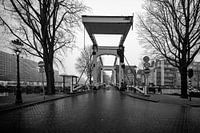 Te zien is een houten ophaalbrug bij de Zandstraat in Amsterdam-centrum op een mistige dag in december 2023.