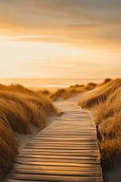 Een schilderachtig houten wandelpad slingert zachtjes door zacht, goudkleurig gras dat gloeit in het warme licht van de avondzon. De horizon, doorkruist door zachte golven, belooft een vredige ontmoeting met de zee. Deze idyllische omgeving nodigt je uit om te dromen en te vertoeven, terwijl de rustige sfeer je het alledaagse leven doet…