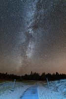 Houten pad in de zandduinen. Nachtelijke hemel vol sterren.