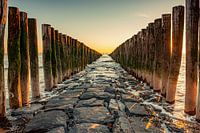 Houten palen in zee en op strand van Dishoek in Zeeland, Nederland tijdens zonsondergang.