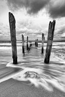Houten palen aan het strand van de Oostzee in het avondlicht, waterbeweging in langdurige blootstelling - Plaats: Oostzee, eiland Rügen