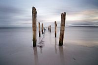 Houten palen aan het Oostzeestrand in het avondlicht, waterbeweging in langdurige blootstelling, rustige melancholische stemming, kijkrichting met dieptewerking door de inrichting van het bos - Ligging: Duitsland, Oostzee, eiland Rügen