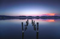 Een houten pier of steiger blijft achter op het meer na zonsondergang. Foto met lange belichting, Versilia, Meer van Massaciuccoli, Toscane, Italië.