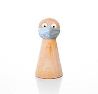 Houten pion op afstand met corona mondmasker en verbaasde blik mondkapje kan toch toegevoegde waarde hebben Mensen zien een mondmasker en denken: mondmasker, corona: ik houd afstand"