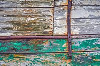 Een kleurrijke, bijna abstracte compositie van verweerde planken, bij elkaar gehouden door roestig staal, met afbladderende groene en witte verf, op de romp van een oude boot in IJsland.