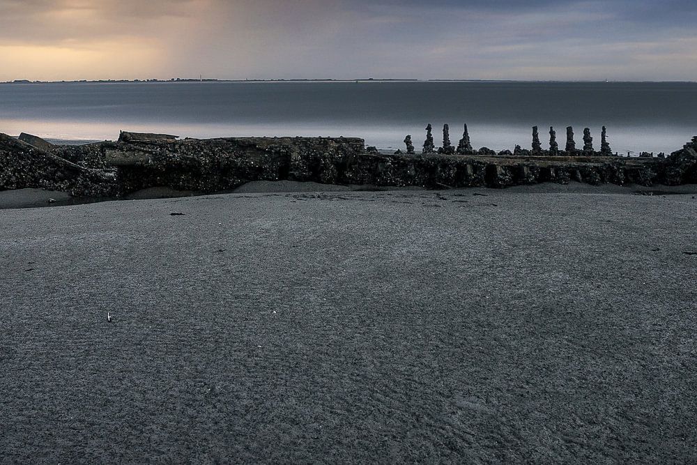 In de nederlandse kust ligt een oude houten scheepswrak. De foto is gemaakt met een opkomende storm.