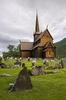 De traditionele, oude staafkerk van Lom in Noorwegen, daterend uit de twaalfde eeuw, met grafstenen op een kerkhof.