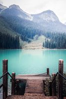 Koop dit landschapskunstwerk Houten steiger aan Emerald Lake Canada | reisfotografie | fotobehang van Laura Dijkslag op canvas, aluminium dibond, (ingelijste) fotoprint, behang en ArtFrame, op maat geprint in Fine-Art kwaliteit.