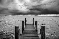 Houten steiger aan de oever van het Belterwijde meer in het natuurgebied Weerribben-Wieden met een naderende onweersbui aan de horizon. Zwart-wit foto.