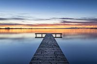 Het water in de Zuiderhaven van Den Oever, aan het IJsselmeer, fungeert als een spiegel. De zon kondigt haar komst aan door de horizon oranje te kleuren, terwijl de aanwezige ster nog een herinnering aan de nacht is.