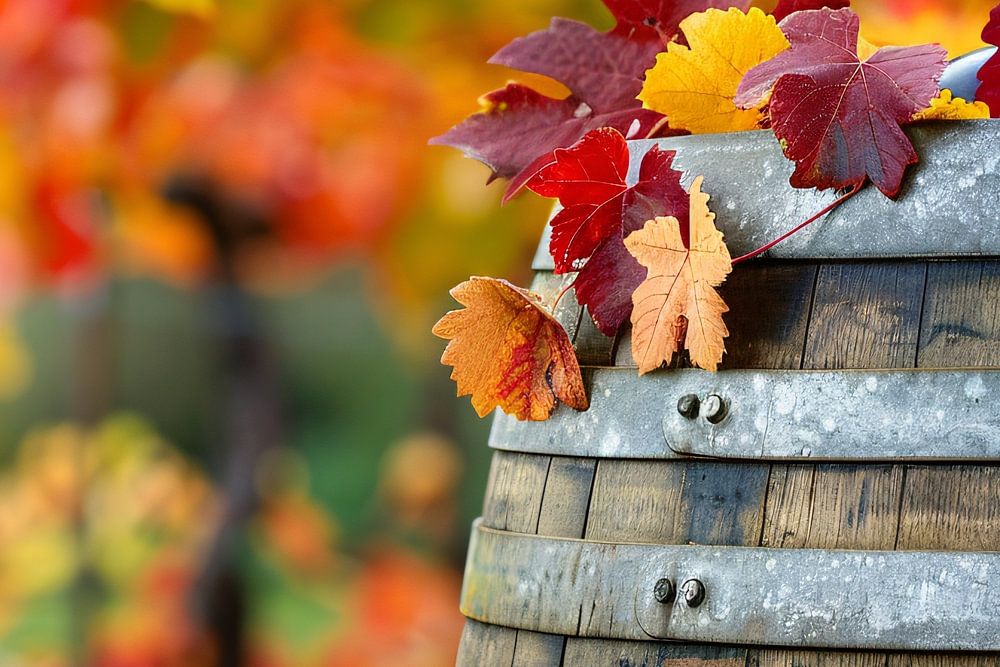 Breng de sfeer van de herfst in huis met deze unieke foto van een houten vat met herfstbladeren. Perfect voor in de slaapkamer of woonkamer.