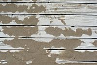 Houten vlonder wit met zand en voetafdruk . Sfeer aan de muur van gewoon een stuk strandhout . Eenvoudig en ongedwongen foto aan de muur. Sfeer van strandhuis en de zee.