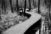 Kronkelend pad van houten vlonders door de bossen van het natuurgebied de Moerputten. Dit natuurgebied ligt in de buurt van 's-Hertogenbosch in Noord-Brabant.