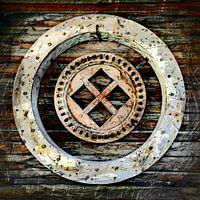 Oude houten wielen van een voormalige watermolen uit Oost-Tirol aan de muur van een schuur, Oostenrijk