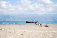 Een houtensteiger in de zee aan de kust van Corfu. Deze lange steiger ligt in de zee aan de noordkust van het Griekse eiland Corfu.