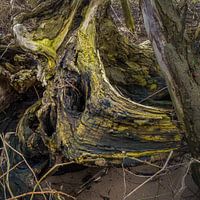 Geheimzinnig dood hout in levendige figuren op de oever van een rivier..