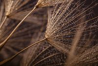 "Houtkleurig pluisje van een Tragopogon met waterdruppeltjes" is een macrofoto van waterdruppels op de pluisjes van een Tragopogon (morgenster). Deze bewerkte foto bestaat voornamelijk uit de kleuren: beige - bruin - champagne kleur met een donkere achtergrond.
