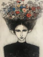 Koop dit bloemen kunstwerk Houtskool gezicht van vrouw met bloemen in haar van Franka Poulain op canvas, aluminium dibond, (ingelijste) fotoprint, behang en ArtFrame, op maat geprint in Fine-Art kwaliteit.