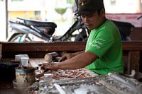 Deze houtsnijder uit Pandai Sikat maakt fraaie houtbewerkingen. Het is een voorbeeld van de kleinschalige economie die veel voorkomt op Sumatra.