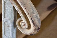 Een close-up van het prachtige houtsnijwerk van een trapleuning, in het spookdorp Kolmanskop in de woestijn in Namibië.