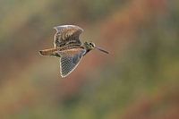 Houtsnip in vlucht gezien tegen een bosrand in de herfst, met veel herfstkleuren.