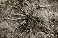 Levend hout op de oever van de rivier de Lek. Deze plantenwortel lijkt op een reuzenspin..