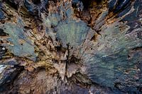 Expressieve vormen in het hout van deze afgezaagde boomstam die ik aantrof tijdens een boswandeling. Ik zag er baltsende vogels in of een pronkende pauw. Door langere tijd aan weer en wind te zijn blootgesteld heeft het hout een bijzondere groene kleur gekregen. Door de aparte uitwaaierende expansieve vormen heeft het beeld een dynamisch karakter, met in het midden een spitsvormige figuren die de fantasie prikkelen....