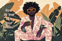 De man heeft een stijlvol afro kapsel dat zijn ontspannen uitstraling benadrukt. Hij draagt een trendy outfit die perfect past bij de tropische omgeving, en zijn oranje zonnebril geeft hem een speelse en modieuze uitstraling. In zijn hand houdt hij een dampende kop koffie, zijn favoriete drankje, dat een moment van rust symboliseert te midden van de drukte van het leven.