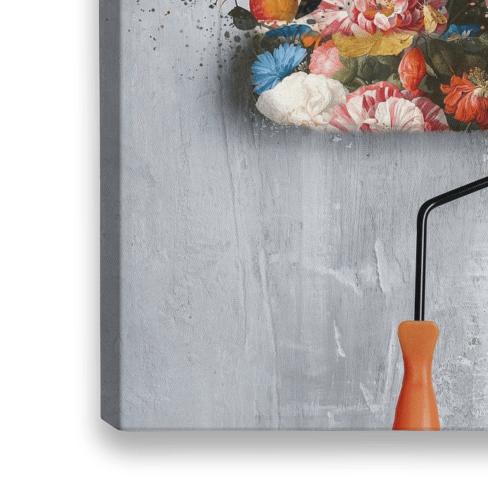 Een muurverfroller die op magische wijze een stilleven met bloemen op een betonnen muur verft.