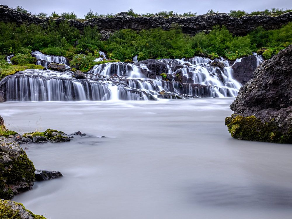 Hraunfossar, in het westen van IJsland, is een reeks watervallen gevormd door water dat over een breedte van ongeveer 900 meter van de Hallmundarhraun in de rivier de Hvita stroomt (de witte rivier). De Hallmundarhraun is een lavaveld dat het resultaat was van een uitbarsting van een van de vulkanen die onder de Langjökull-gletsjer liggen.