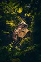 Een rustige rivier, een kloof en een klein houten huisje, dat je kunt vinden in de Bomische Schweitz in hrensko.