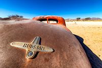 De roestige verbogen kofferbak van deze oude Hudson ontneemt je bijna het zicht op de rest van de auto. Nog net is het dak en een deel van de auto te zien. Prachtig contrast tussen het roestige bruin en het oranje van de kleur van de carrosserie