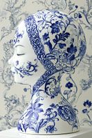 Dit kunstwerk toont een sereen vrouwenhoofd, volledig beschilderd in een Delfts blauw bloemmotief, alsof het van porselein is gegoten. De dromerige expressie en gesloten ogen versterken het gevoel van verstilling en schoonheid. De sierlijke patronen lopen over in de achtergrond, waardoor kunst en omgeving naadloos samensmelten. Een…