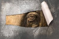 Een eenzame traan baant zich een weg over de gerimpelde wang van deze oude olifantendame. Dmv fotomanipulatie dit effect verkregen. Het papier wordt opengescheurd om de traan en het oog in kleur te laten zien.
