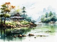 Schilderij van een idyllisch tafereel bij de rivier met een huis in Chinese stijl en een loopbrug.