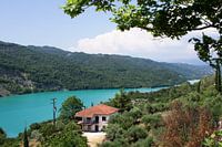 Een huis aan een mooi blauw-groen meer in Griekenland