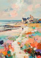 Een impressionistisch kustschilderij toont een lichtgekleurd pad dat leidt naar een huis van twee verdiepingen met blauwe luiken en een kleine toren. De pastelkleurige penseelstreken in roze, beige, blauw en groen geven beweging en structuur aan de voorgrond. Twee kleine figuren lopen over het pad, een naar het huis toe, een ervan weg.…