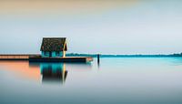 Een huis staat op het water bij een rustig meer, minimalistisch, surrealistisch, helder cyaan en rood.