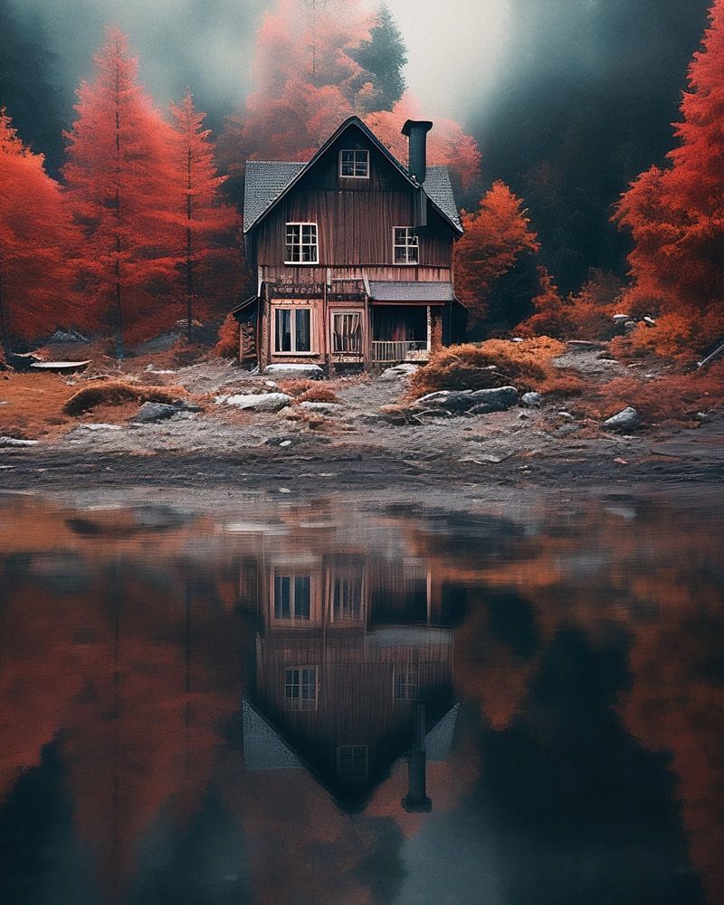 Romantische sfeer met een huis aan het meer in de herfst