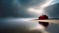 De afbeelding toont een huis aan zee in minimalistische vorm. Een dramatische lucht versterkt het effect van de afbeelding....Dit is een digitale kunstafbeelding die door mij is gemaakt - op basis van mijn eigen referentieafbeeldingen - met behulp van tools voor compositie, AI-generatie en fijnafstemming.