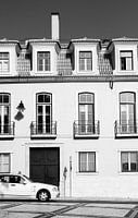 Detail van een huis met auto (taxi) in Lissabon, Portugal. De foto is in zwart wit. De architectuur is strak en regelmatig.