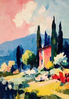 Dit abstracte schilderij toont een kleurrijk landschap met in het midden een roze, rechthoekig gebouw. Daarachter rijzen drie donkere cipressen op die een sterk verticaal contrast vormen met het horizontale kleurvlak. De weiden en velden op de voorgrond bestaan uit levendige tinten geel, groen en blauw, aangebracht in brede,…