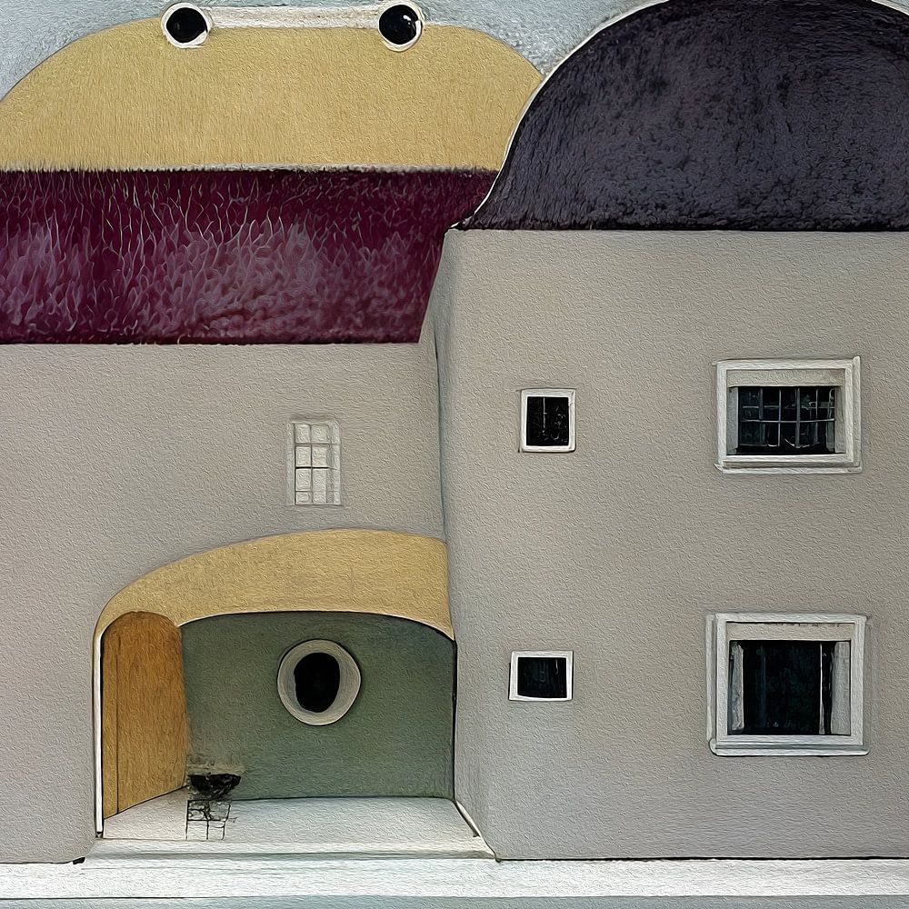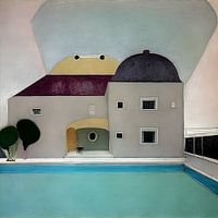 Een surrealistisch tafereel toont een eigenaardig huis, geschilderd in verweerde pastelkleuren, met een groot zwembad dat zich voor de gevel uitstrekt. De ongebruikelijke combinatie van vervallen tinten en een imposant zwembad creëert een betoverende en enigmatische sfeer. Het huis lijkt rechtstreeks uit een droom te komen, waar de grens tussen het gewone en het buitengewone vervaagt. De kijker wordt uitgenodigd om te dwalen in deze fascinerende en ongewone omgeving.