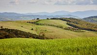 Glooiende heuvel groene kant zover het oog reikt, versierd met een rij cipressen die naar een eenzame villa leidt.