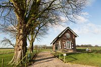 Een sprookjesachtig huis met rood-witte luiken aan de doodlopende Hoeksedijk op het eiland van Schalkwijk bij de Lekdijk op de grens van Houten en Wijk bij Duurstede.