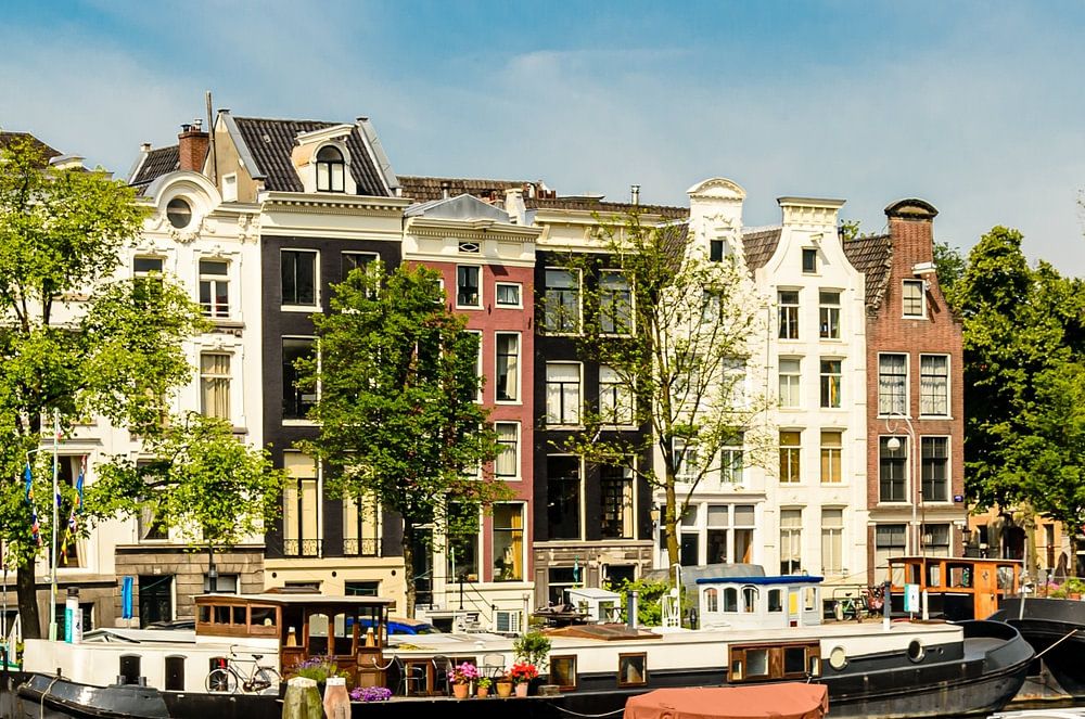 Huisgevels boten en woonboten op gracht in Amsterdam centrum in Nederland