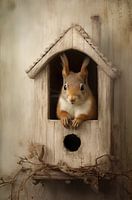Een schattige eekhoorn steekt nieuwsgierig zijn kopje naar buiten vanuit een houten vogelhuisje. De warme kleuren en fijne details geven het beeld een knusse en bijna sprookjesachtige sfeer. Een speels werk dat zowel vertederend als decoratief is en in elk interieur een glimlach brengt.
