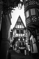 Ten eerste benadrukt zwart-wit fotografie de vormen, lijnen en texturen van het Spitzhäuschen. De contrasterende vakwerkconstructie komt nog beter tot zijn recht zonder de afleiding van kleuren. De duidelijke lijnen van het houtwerk en de onregelmatigheden in de stenen muren worden extra benadrukt, waardoor de architecturale details meer opvallen.