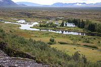 Huisjes en kerk in Thingvellir Nationaal Park in IJsland. In dit park is de democratie van IJsland ontstaan. Hier zijn diverse kloven waartussen de politici samen kwamen en waarin zij vergaderden.